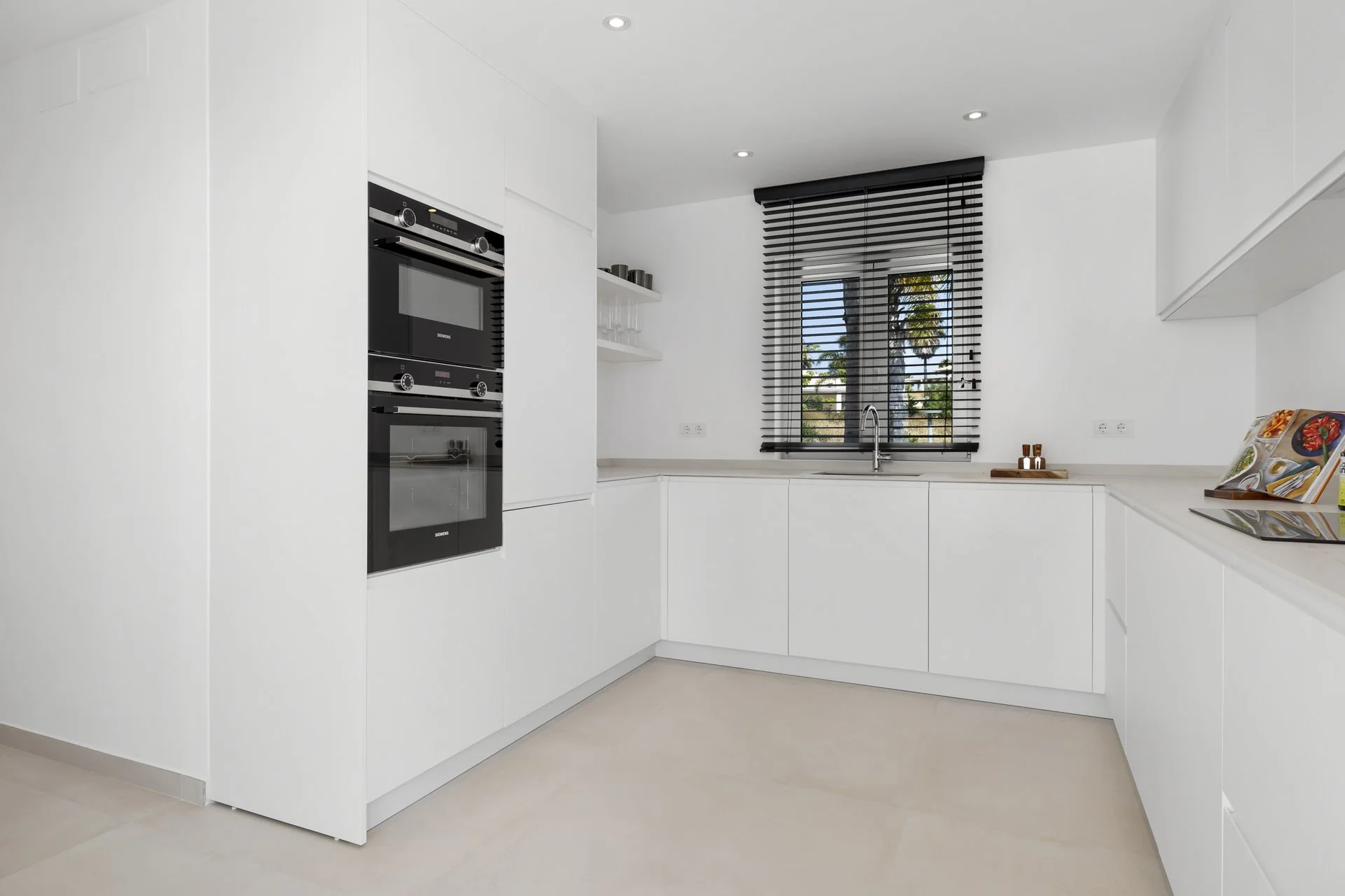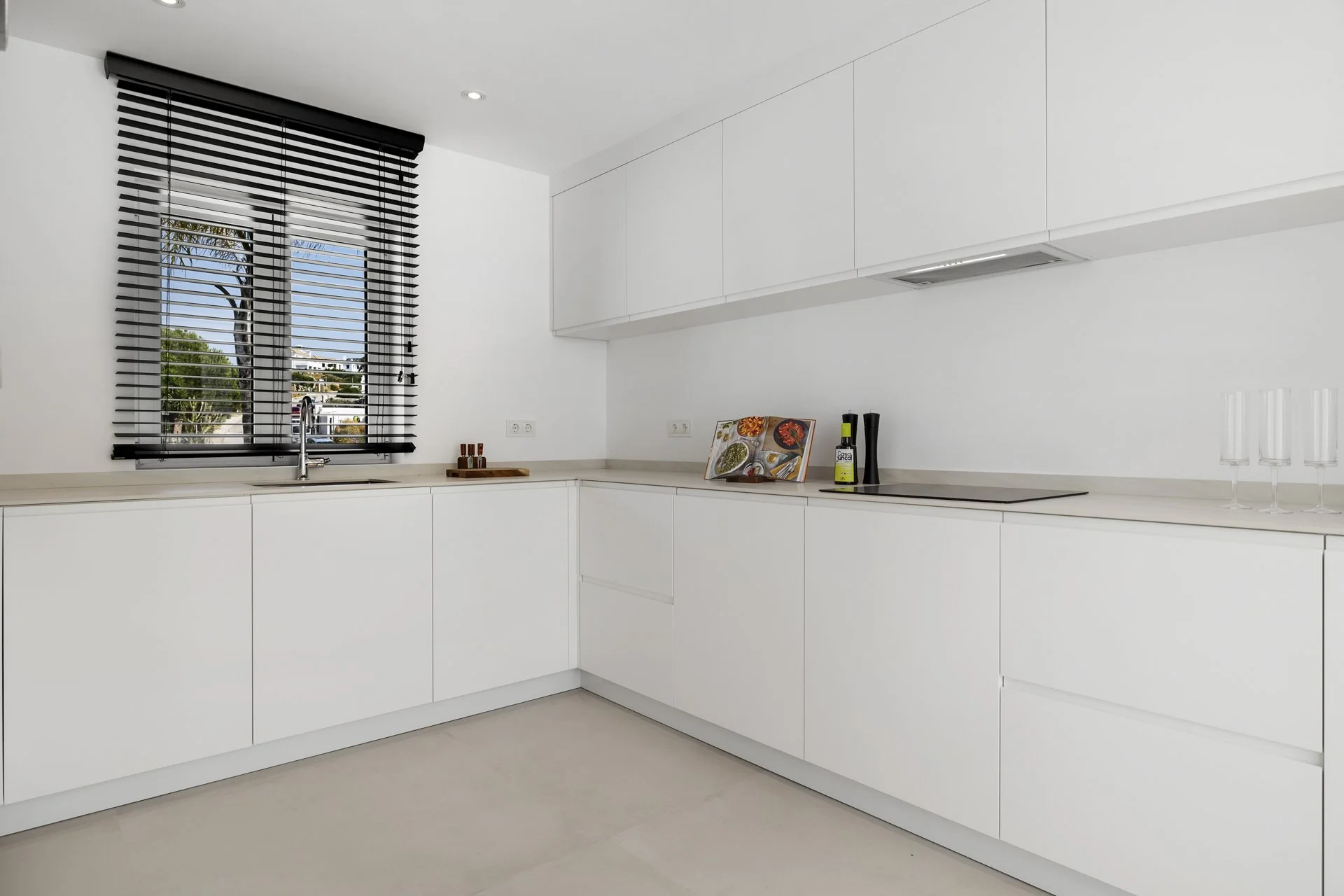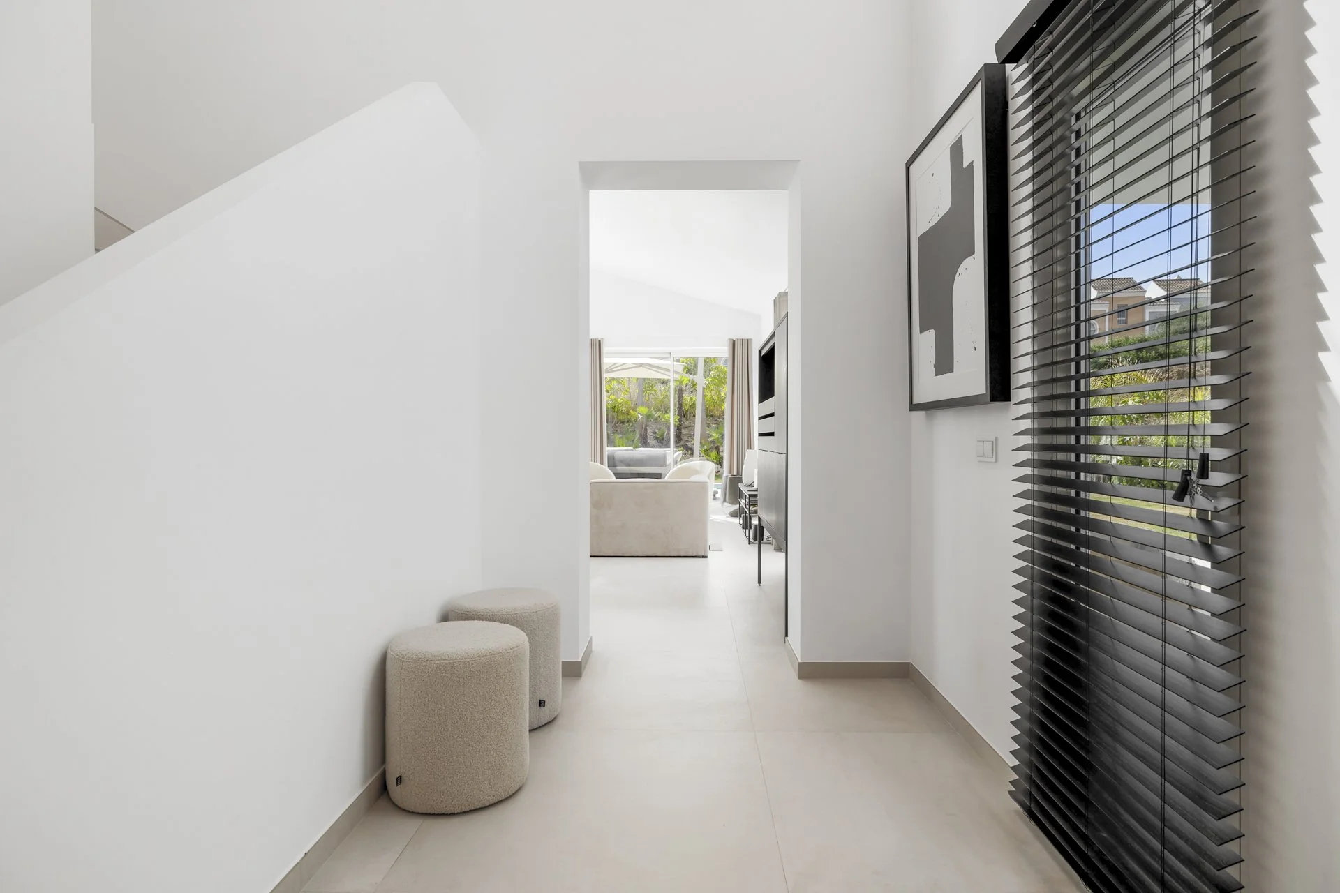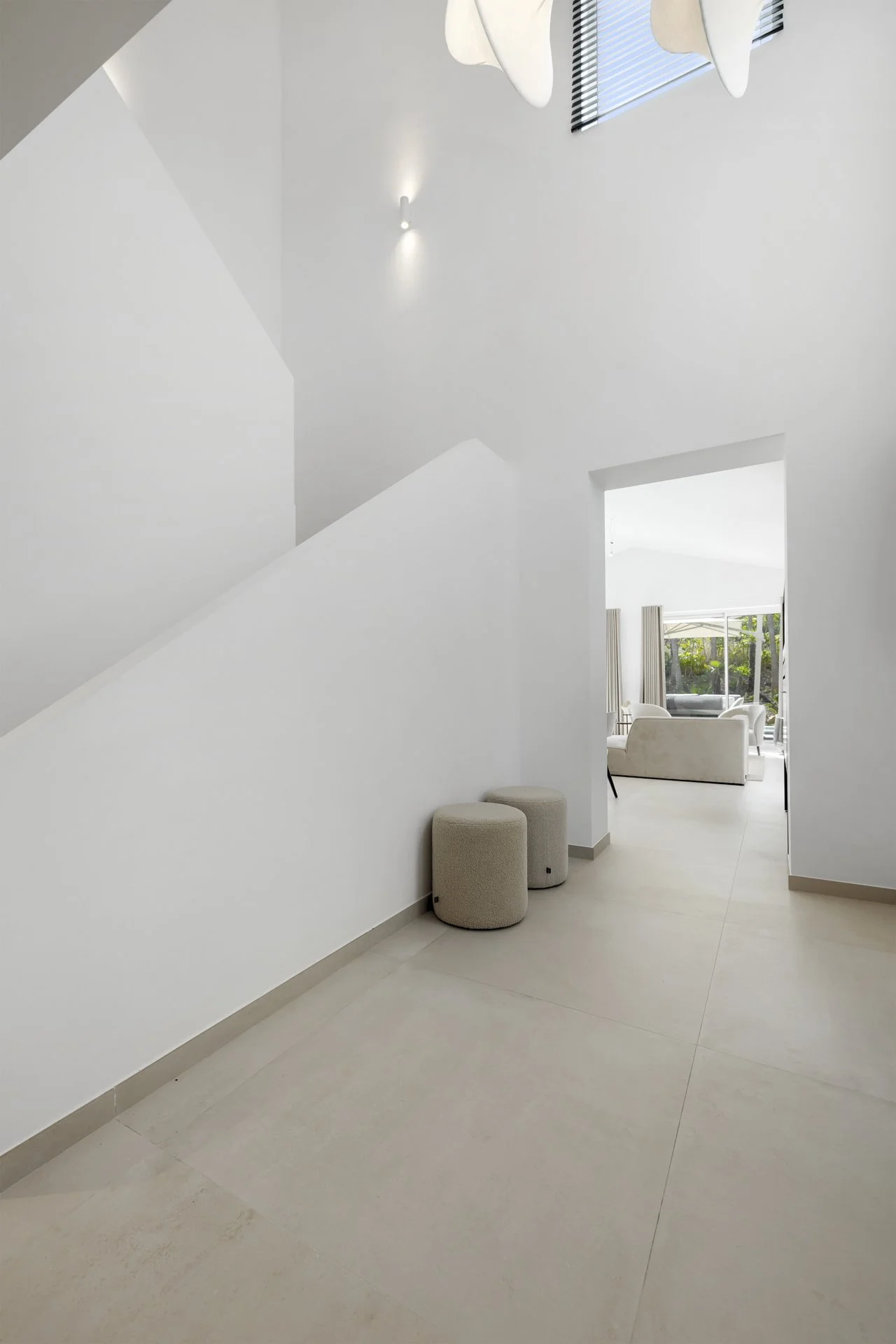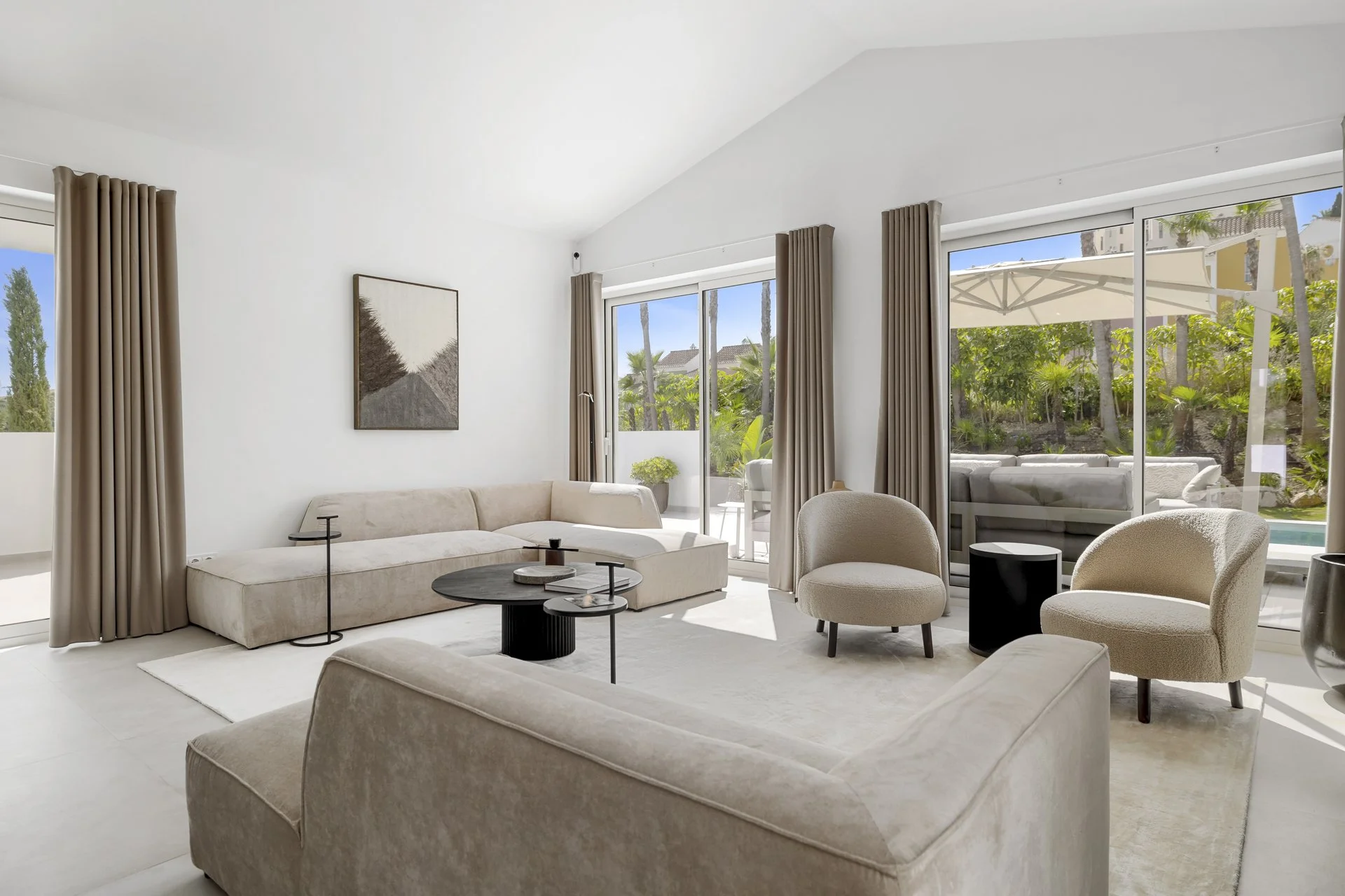 Step into a double-height entrance hall and discover a home designed for relaxed, elegant living. The ground floor offers a large, open-plan lounge with a fully fitted kitchen featuring Siemens and Bosch appliances. Wide sliding doors lead directly out to the terrace, garden, and pool – all on one level, no stairs needed. Multiple terraces let you follow the sun or find a shady spot.